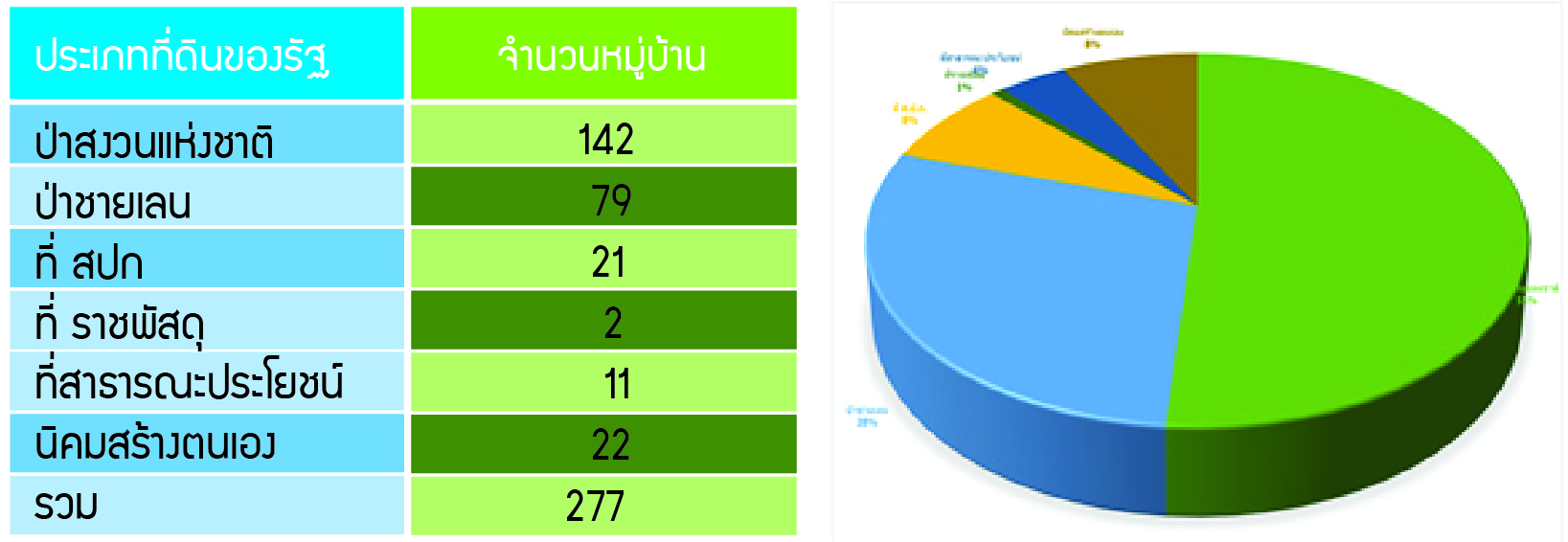 ข้อมูลชุมชนหมู่บ้านในพื้นที่ป่าไม้ของสภาชนเผ่าพื้นเมืองแห่งประเทศไทย ในช่วงปี 2564 – 2565 พบว่า มีหมู่บ้านชนเผ่าพื้นเมืองในประเทศไทยที่กระจายอยู่ในพื้นที่ป่าไม้ทั่วประเทศมีไม่ต่ำกว่า 3,294 หมู่บ้าน โดยอยู่ในพื้นที่ป่าสงวนแห่งชาติ 2,875 หมู่บ้าน พื้นที่อุทยานแห่งชาติ 291 หมู่บ้าน และเขตรักษาพันธุ์สัตว์ป่า 128 หมู่บ้าน ในขณะที่ข้อมูลผลการดำเนินการของรัฐเกี่ยวกับการสำรวจและจัดสรรที่ดินทำกินให้ประชาชนตามนโยบายที่ดินแห่งชาติและนโยบายป่าไม้แห่งชาติเพื่อแก้ไขปัญหาการอยู่อาศัยและทำกินของประชาชนในที่ดินป่าไม้ของรัฐตามมติครม. 22 ธันวาคม 2558 โดยตั้งแต่ปี 2559 ถึง มกราคม 2564 มีการดำเนินการไปได้เพียง 277 หมู่บ้านทั่วประเทศ โดยกระจายอยู่ในที่ดินของรัฐประเภทต่างๆ ซึ่งไม่รวมพื้นที่ป่าอนุรักษ์ดังนี้