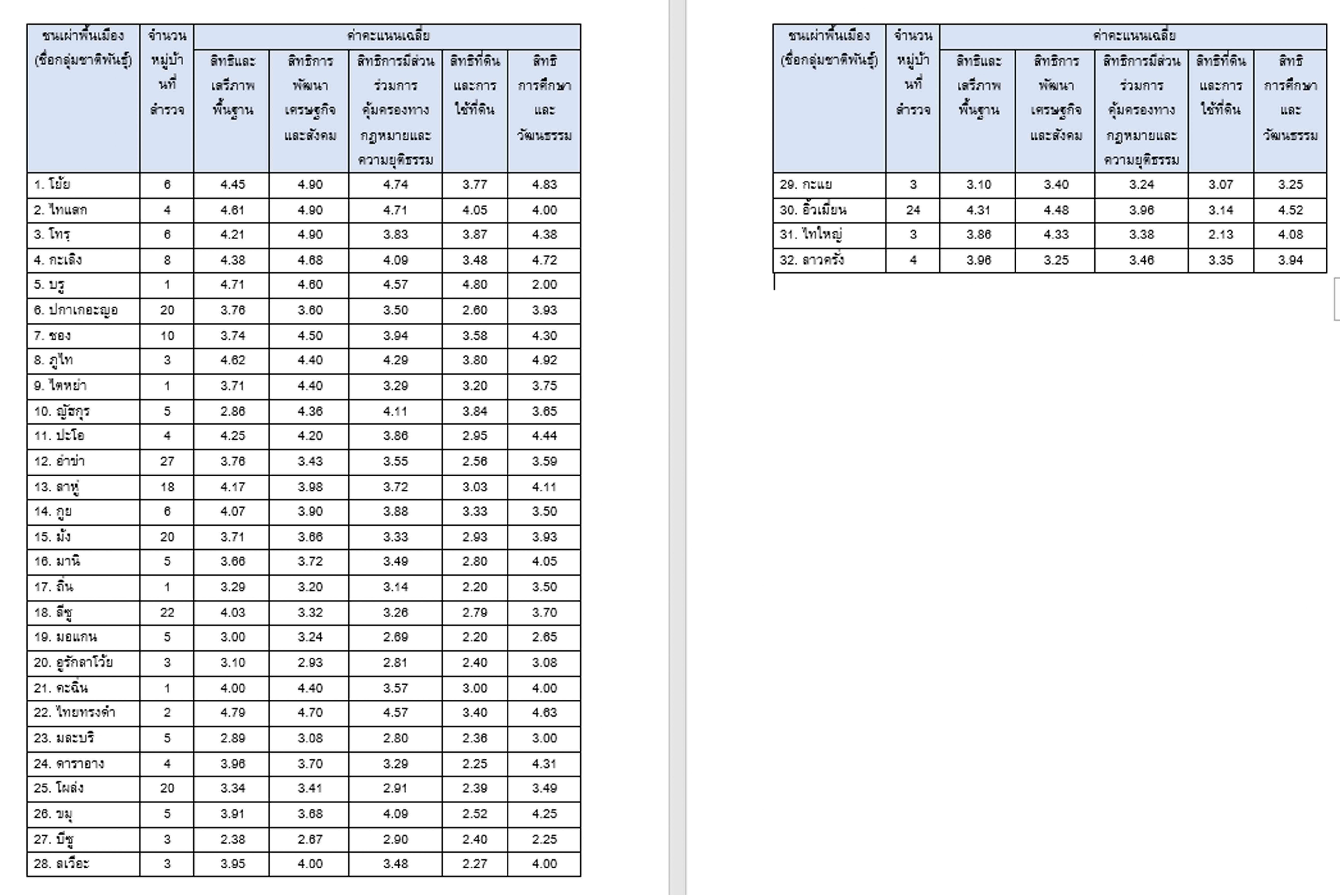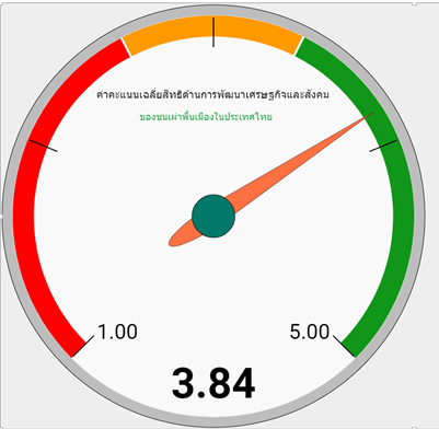 ผลการประเมินสิทธิด้านการพัฒนาเศรษฐกิจและสังคมของชนเผ่าพื้นเมืองในประเทศไทย พบว่า มีค่าคะแนนเฉลี่ยอยู่ที่ 3.84 หมายถึงมีสิทธิด้านการพัฒนาเศรษฐกิจและสังคมอยู่ในระดับมาก